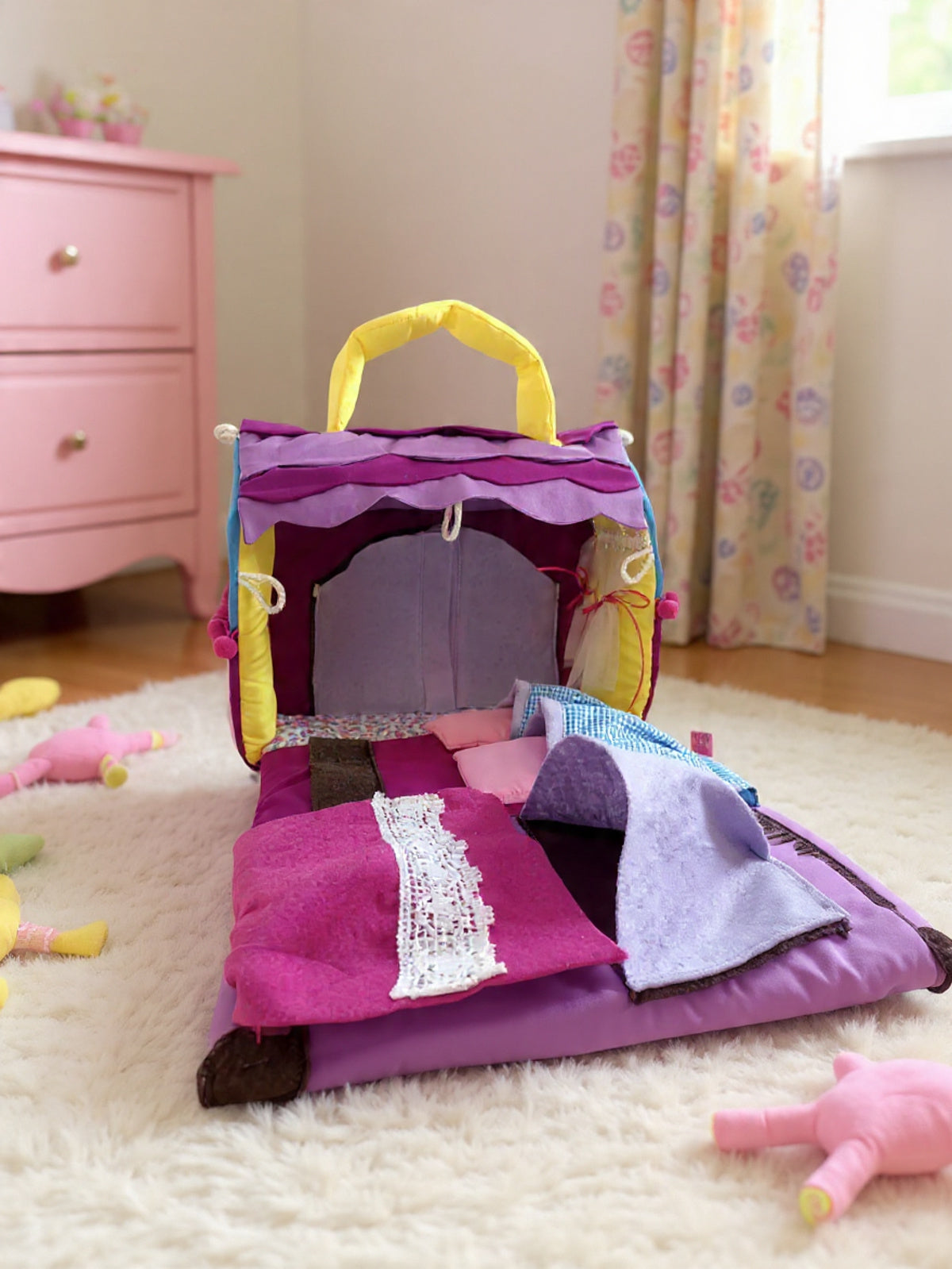 al abrirla se convierte en escenario lleno de detalles para pasar horas de diversión muebles hechos de fieltro y tela con apliques que convierten cada detalle único un ropero adaptado para colgar ganchitos de verdad dos camas esponjadas una tina con toallero para complementar esta habitación se suman detalles como repisas y cortinas con detalles especiales.