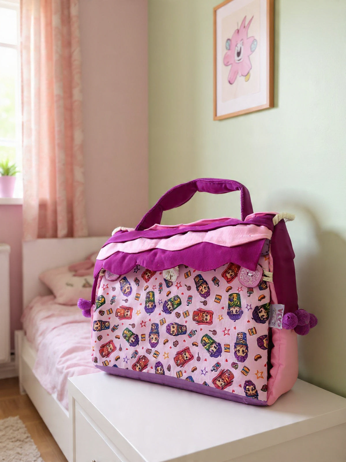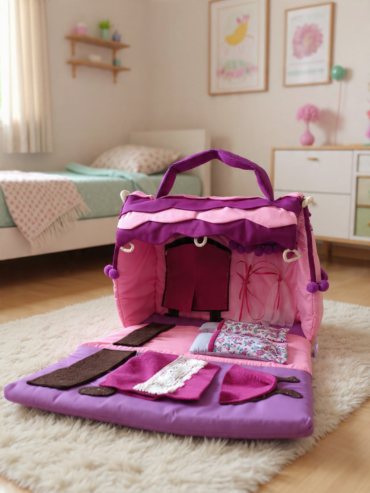 Cuenta con dos camitas funcionales en donde pueden acostar a sus muñequitas un armario adaptado para que se puedan colgar ganchitos miniatura, una tina con su toallero y detalles como cortinas y repisas en donde puedes guardar accesorios miniatura para complementar tu bolsos casita de tela. Tambien los puedes encientrar aqui en la tienda