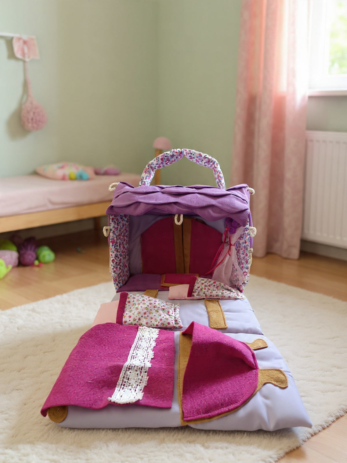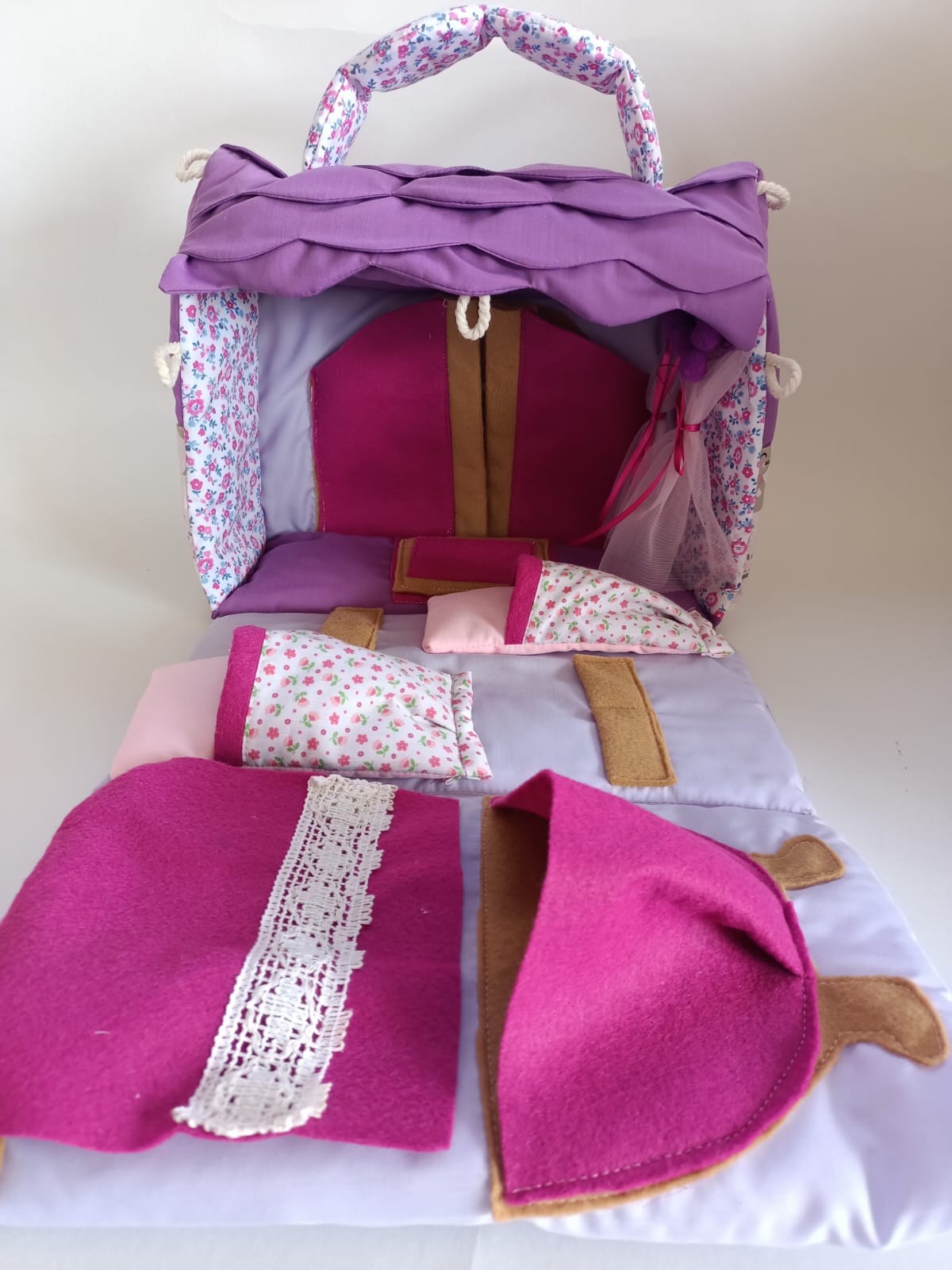 Cuenta con 2 camitas para tus muñecas mini mini, un ropero, una tina de baño y unas repisas todo hecho de fieltro.